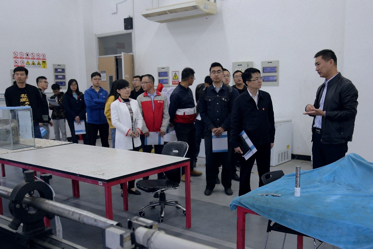 共建交流会议前,中建国际投资(江苏)有限公司来访的10名党员在学院员工党建指导老师刘晴的陪同下,在深部岩土力学与地下工程国家重点实验办公室主任赵春晓老师的讲解下参观了实验室。