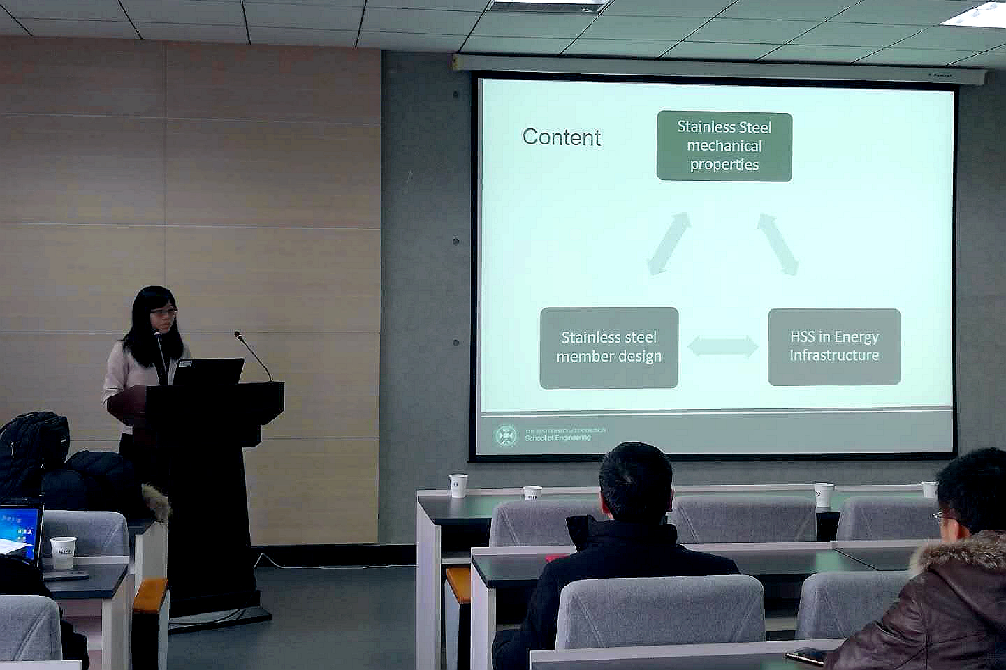 2019年12月13日,英国爱丁堡大学黄韵儿博士来公司开展学术交流。访问期间,黄博士在深部岩土力学与地下工程国家重点实验室305报告厅举办了学术报告,报告题目为“Structural Performance and Design of Stainless Steel and High-Strength Steel Members”。报告主要介绍了常(高)温下不锈钢应力-应变本构模型、不锈钢与高强钢构件力学性能试验、数值模型和相关设计理论研究等。在座师生与黄博士就不锈钢构件火灾行为及其工程应用等方面进行深入热烈的交流与讨论。报告会由张营营教授主持。最后,黄博士参观深部岩土力学与地下工程国家重点实验室、结构工程实验室及火安全实验室等,并提出一些建议。