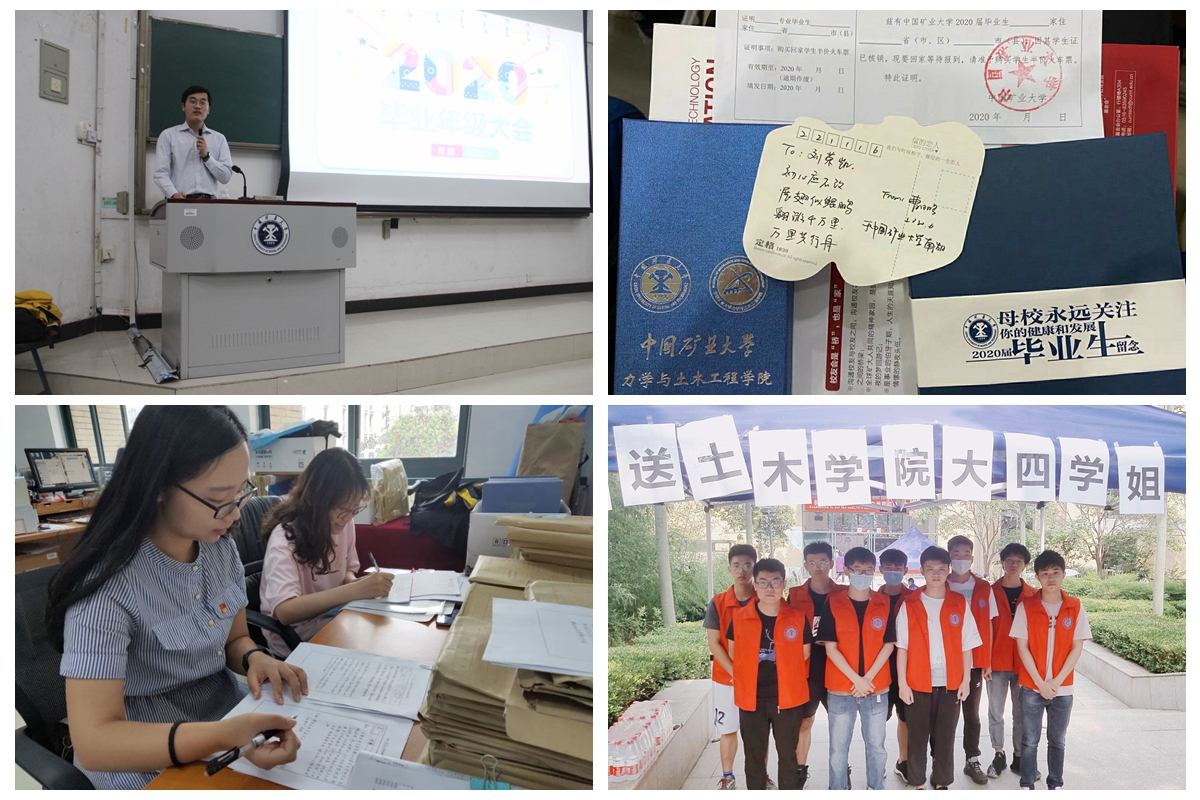 加强引领,为毕业生武装思想。学院紧抓毕业季思想教育契机,通过多种途径推进毕业生思想教育工作。积极开展爱国主义教育和理想信念教育,鼓励员工追求卓越,砥砺奋进,为国家建设和学校发展贡献力量;强化党员教育培养,组织讲授毕业生党员党课,发布《致毕业生党员的一封信》,设立毕业生党员24小时值班点,提升毕业生党员党性修养,发挥党员先锋模范作用;通过毕业生年级大会,开展诚信教育和法纪教育,引导员工树立规则意识;发布《毕业生文明离校倡议书》,以团支部为单位设置文明离校督导员,营造文明离校氛围;积极发挥榜样引领作用,推荐91人次参评中国土木工程学会、江苏省土木工程学会和公司的优秀毕业生,组织优秀毕业生代表与低年级员工交流,在学院网站、“CUMT青春小木”微信公众号等媒体平台宣传报道优秀毕业生和集体事迹,引领、激励更多土木学子追求卓越。