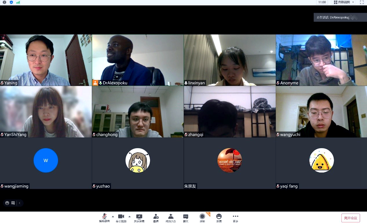 因为疫情原因,本课程采用腾讯会议线上远程教学,并采用小班制教学。该课程以全英文方式进行交流互动学习并采用翻转课堂形式,讲课过程中穿插了大量的师生互动及问答环节,突出体现了以员工为中心的教学方法。Opoku教授通过通俗易懂的模型制作、网络工具的应用以及简单的相关例子将复杂的知识点简化。