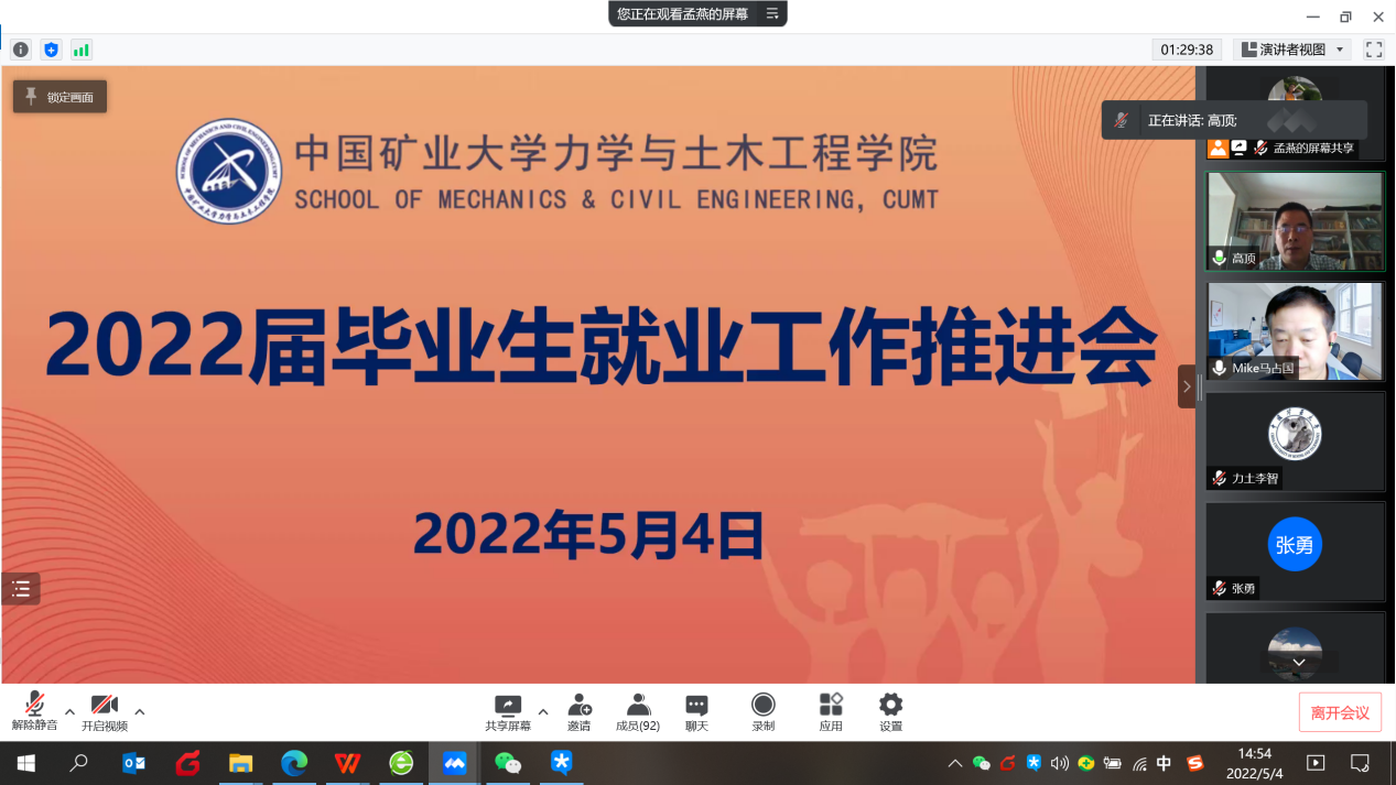 为贯彻落实好国家、江苏省关于2022届毕业生就业工作相关会议和学校近期关于就业工作的会议精神,分析研判学院2022届毕业生就业工作形势,全力做好“稳就业”、“保就业”工作,切实推进学院毕业生实现充分就业和高质量就业,5月4日下午,学院通过线上开展2022届毕业生就业工作推进会。党政领导、各系所主任、党支部书记、研究生毕业生导师、本科生毕业班班主任、毕业年级辅导员参加了会议,会议由马占国经理主持。