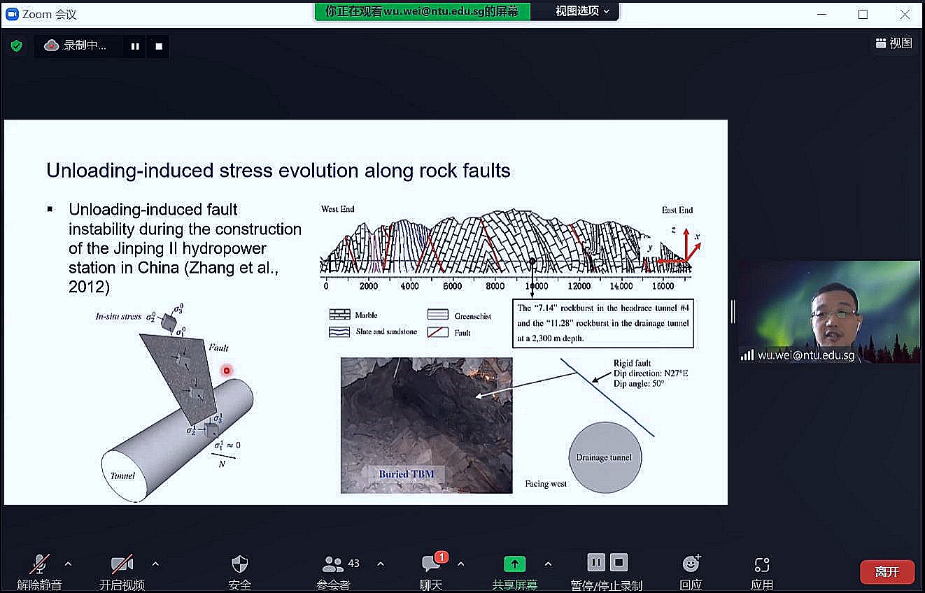 开幕式后,5月26日下午-27日全天,共一天半的时间,与会专家学者围绕地下空间资源开发与利用这一主题共3个单元进行了交流研讨,共计4篇特邀报告,9篇邀请报告,24篇口头报告,取得了丰硕的学术成果。4篇特邀报告为:新加坡工程院院士、新加坡国立大学的梁春晖教授作了题为“实现可持续性和低碳:新加坡展望”的报告,英国帝国理工大学的张广磊博士后作了题为“多孔岩石中多相流的储层条件孔隙尺度成像”的报告,武汉大学周小平教授作了“裂纹扩展和聚并的场强化有限元方法”的报告,新加坡南洋理工大学吴为教授作了题为“深部岩石开挖诱发地震:影响和挑战”的报告。9篇邀请报告为:波兰矿业冶金大学Malkowski教授作了题为“地下工程湿式底鼓模拟新方法”的报告,中国科学院武汉岩土力学研究所陈炳瑞研究员作了题为“一种基于深度学习的微地震波形实时到达拾取器”的报告,俄罗斯圣彼得堡矿业大学Chanyshev Anvar Ismagilovich作了题为“岩土材料耐久性理论的现代发展趋势及非线性岩土力学的逆向思考”的报告,威廉希尔足球官网经理马占国教授作了题为“深部煤矿地下空间四维高效建设与再利用研究”的报告,威廉希尔足球官网王建国教授作了题为“非均质人工地热储层产热的不确定性分析”的报告,威廉希尔足球官网副经理杨圣奇教授作了题为“不同围压下横观各向同性复合岩石的变形与破坏行为”的报告,威廉希尔足球官网煤炭资源与安全开采国家重点实验室蔡武副研究员作了题为“断层型地热储层中流体注入与诱发地震活动的相关性:来自数据驱动分析和数值模拟的见解”的报告,山东大学王汉鹏教授作了题为“多应变率动静荷载叠加岩石力学实验关键技术的报告”,俄罗斯圣彼得堡矿业大学Alexandr S. Egorov教授作了题为“欧亚大陆北部胶结基底与台地盖层的构造分类与深部构造”的报告。