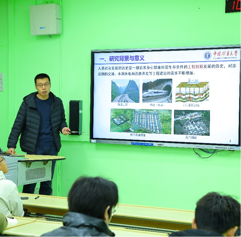 刘日成研究员从试验设备研制、理论推导等方面进行讲述,提出了裂隙岩体剪切-非线性渗流仿真方法,并形成裂隙岩体渗透失稳灾变防控技术,解决了地下工程渗漏水和渗透失稳难题,并通过实际工程案例阐释了此项技术在裂隙岩体中的应用。他表示,这项技术对于解决地下工程中的渗漏水问题具有重要作用,特别是在复杂地质条件下的隧道工程中,鼓励同学们投身于岩土工程领域的工作和研究。